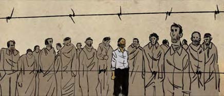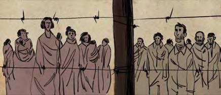 On retrouve aussi cette idée dans les contours des personnages. Dans le passé, ils sont plus nerveux, moins précis, comme dans les croquis de Josep Bartolí. Au contraire, les traits sont plus nets, continus, sans ruptures, lorsque l’on se retrouve à Marseille et New York avec Valentin. Là aussi, ce choix graphique peut être associé à l’état des personnages et comment ils réagissent à leur environnement. Dans les camps, leurs contours donnent l’impression qu’ils sont prisonniers de l’arrière-plan [13]. Dès qu’ils en sortent ou entrent en résistance, ils se détachent du décor, comme s’ils avaient retrouvé un peu de liberté dans l’image [14].
